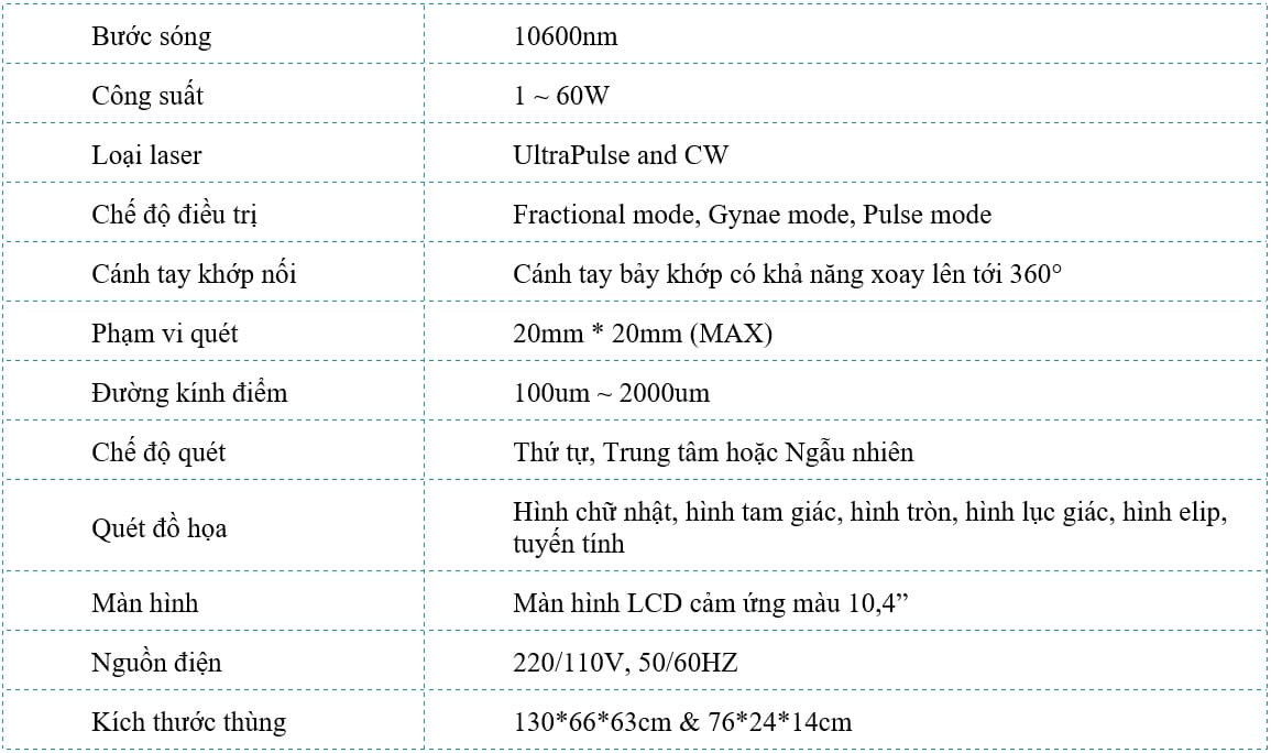 - Chế độ Fractional (thẩm mỹ), chế độ xung (phẫu thuật), chế độ Gynae (phụ khoa), 3 chế độ điều trị có thể đáp ứng mọi nhu cầu của bác sĩ thẩm mỹ, bác sĩ phẫu thuật thẩm mỹ, bác sĩ phụ khoa.